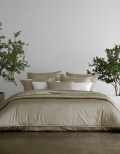 通常シーツは40~60番手の綿糸を使用されますが、こちらは、120番手を使用。ハイブランドやメゾンのドレスシャツに使用されるような紡績糸で仕上げるところは、高級ビスポークシーツブランドならでは。Mirabel Slabbinckの高い技術が生み出す、細番手で贅沢に織り上げられたシーツは、とても美しい光沢と、他では味わえないような洗練されたの肌触りを体感できます。